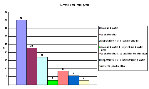 Terčeljevo kratko prozo sem glede na dolžino besedil, eno- oz. večpramenskost zgodbene zasnove in pomembnost razpoloženja, ozračja v besedilu razdelila na zelo kratko prozo, črtice in kratko pripoved. Med zelo kratko prozo sem uvrstila besedila, krajša od 1000 besed, med črtice pa tista, ki imajo od 1000 do 8000 besed (dolžina Terčeljevih črtic se giblje od 1000 do 3500 besed), in kjer je od samega dogodka ali pripetljaja pomembnejše čustveno razpoloženje, ki ga črtica posreduje bralcu. Ob zornih mašah ... sem označila kot kratko pripoved in ne kot črtico, ker je zgodbena zasnova večpramenska. Besedila sem razdelila tudi glede na tematiko. Ugotovila sem, da največji delež zavzemata socialna in verska tematika.